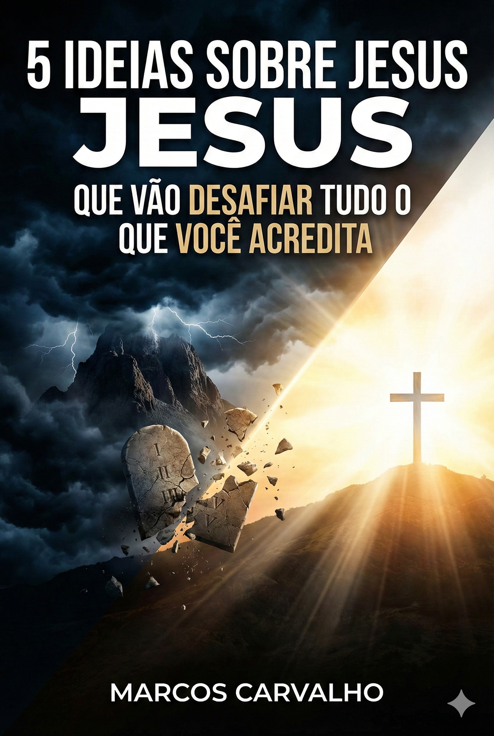 Livro digital explorando cinco teses desafiadoras sobre Jesus Cristo. O texto analisa a oposição entre a Graça de Jesus e a Lei Mosaica, questionando a continuidade com o Deus do Antigo Testamento e os pilares do poder da época
